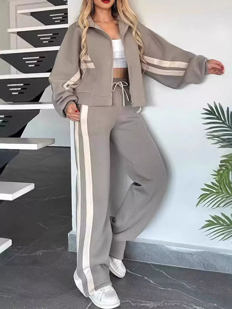 Women Striped Zip Up Outerwear And Pants Set