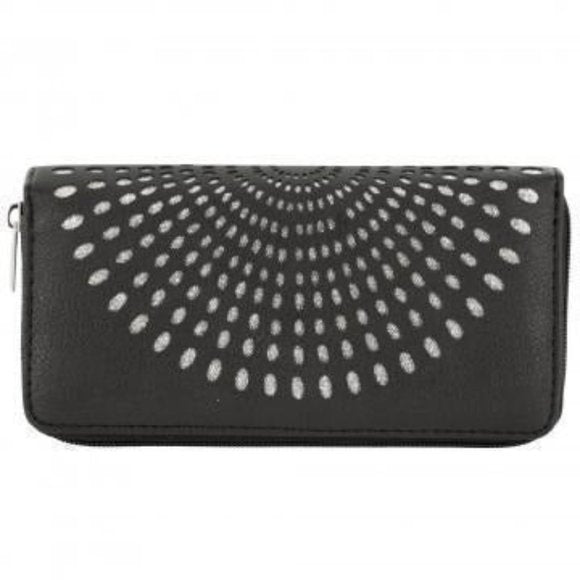 Perfect for going out, this black fan design clutch wallet features a small vinyl clutch with a sparkly silver cutout design and divided sections, a zipper pocket and cards pockets inside. Clutch closes with a durable plastic zipper with a shiny silver pull. Measures approximately 7.625" x 1" x 4".