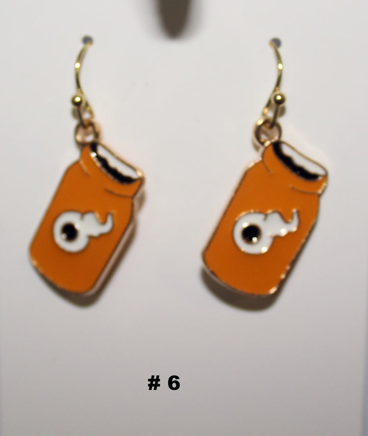 Orange jar-shaped handmade earrings with a small figure