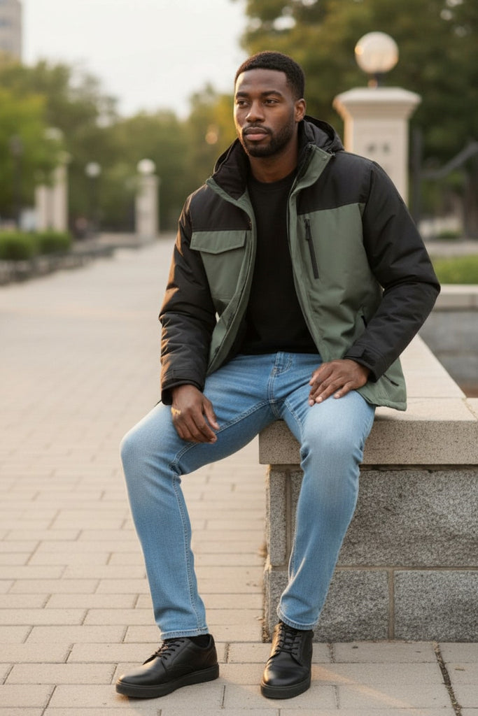 This men's green and black thick hooded jacket combines style with functionality. Designed for versatility, it offers reliable protection against the elements while maintaining a sharp, modern look. Its hood enhances weather resistance, making it ideal for outdoor activities or casual wear. The durable materials ensure long-lasting comfort and performance throughout the seasons.