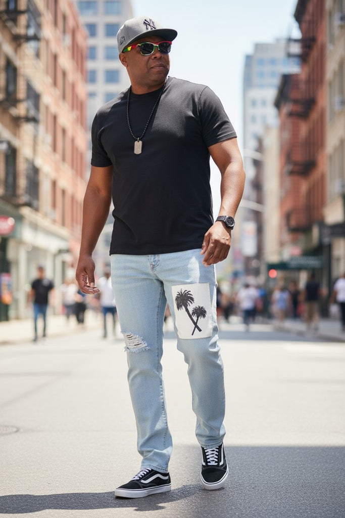 Denim Blue Palm Tree Patchwork Jeans