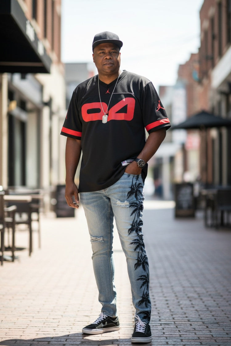 These Men ripped skinny palm tree Jeans feature a slim fit, stylish palm tree prints and ripped details for an edgy look. Ideal for weekend wear, they combine comfort with fashion for a stylish, versatile look.