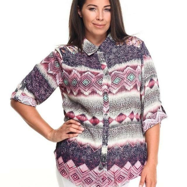 Plus size full button down blouse Full button down closure 3/4 sleeve with roll-up option Rounded hem Color Slash print 100% Polyester