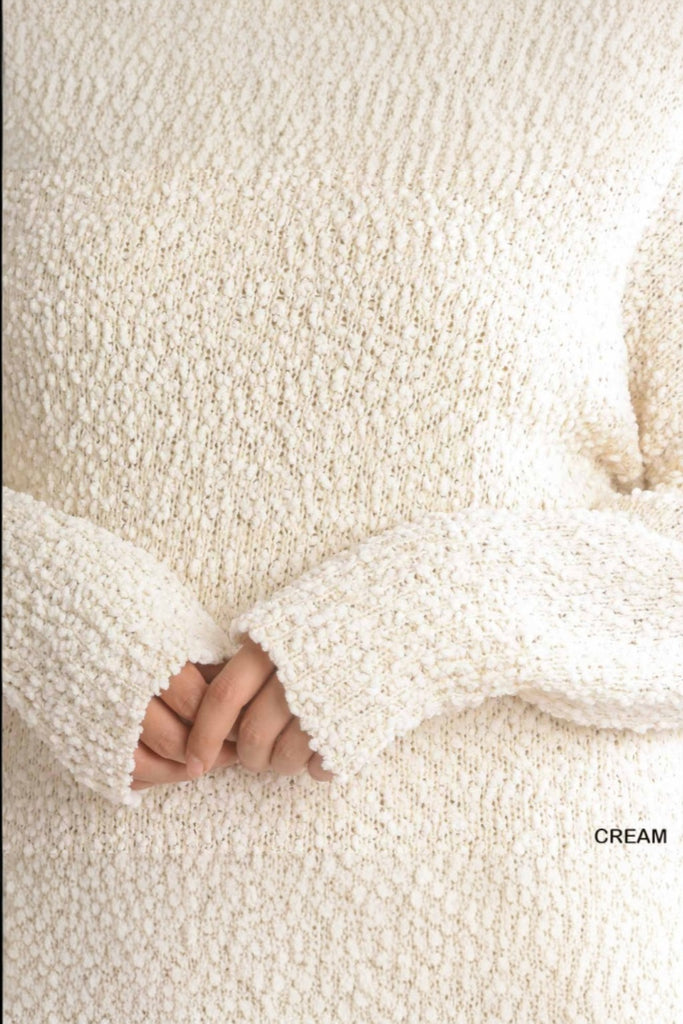 2. Design: The high cowl neck adds a touch of elegance, while the bouclé texture and long sleeves create a stylish and winter-ready look. The relaxed fit ensures comfort without compromising on fashion.