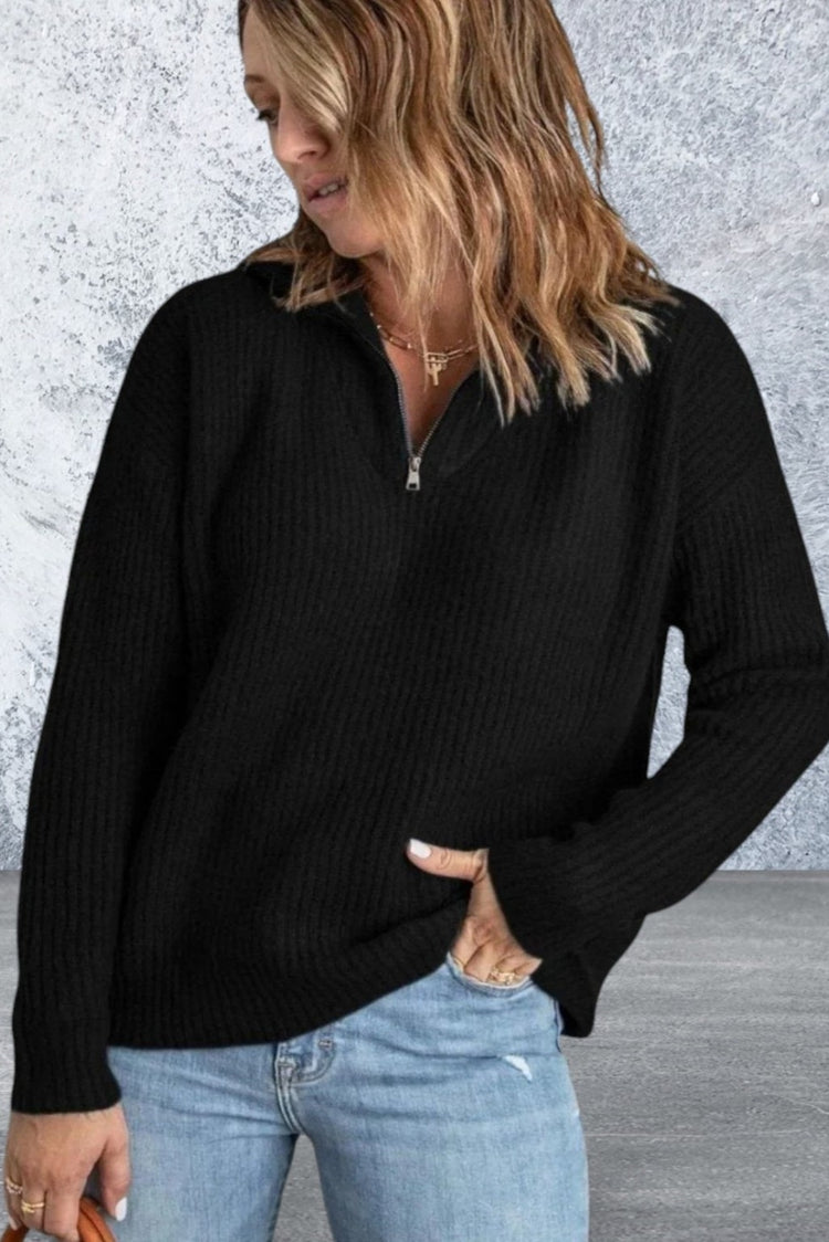 Stay warm and stylish in our women's black zip neck knitted lightweight fall Sweater. Made with a cozy knit and a sleek zip neck, this sweater is perfect for any wardrobe. Its classic black color makes it easy to pair with any outfit, providing both comfort and versatility. Expertly crafted, this sweater will keep you fashionable and comfortable all season long.